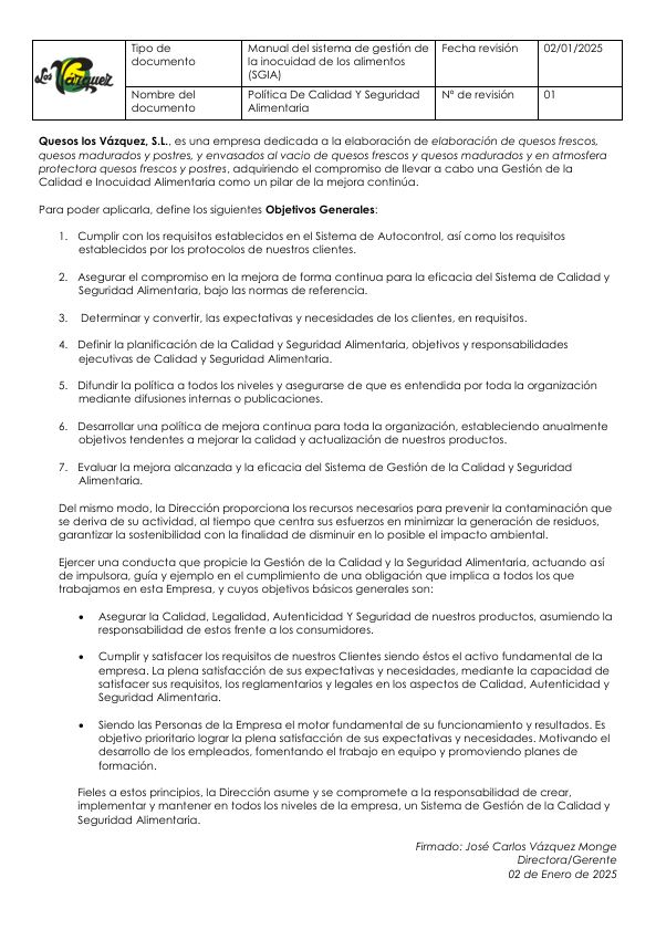 Política de Calidad y Seguridad Alimentaria de Quesos los Vázquez, S.L.